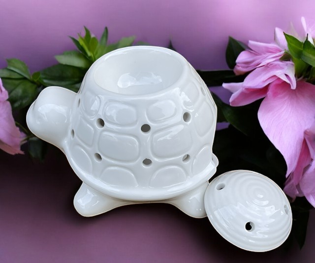 Entièrement blanc, le sommet de sa carapace se lève pour accueillir vos cires parfumées, senteurs, huiles essentielles et autres solutions parfumées.